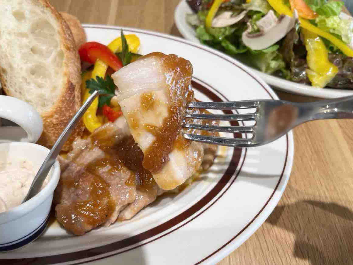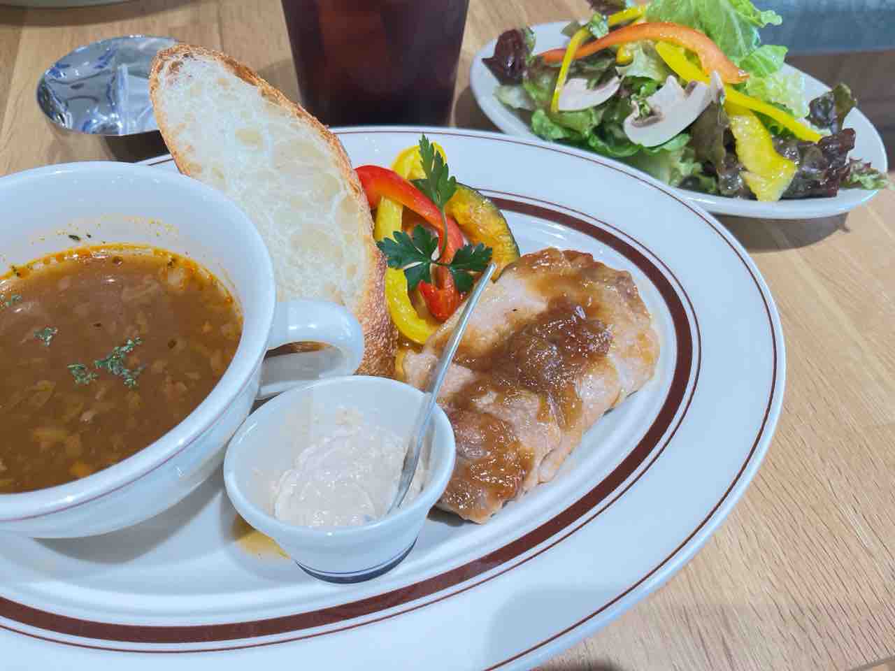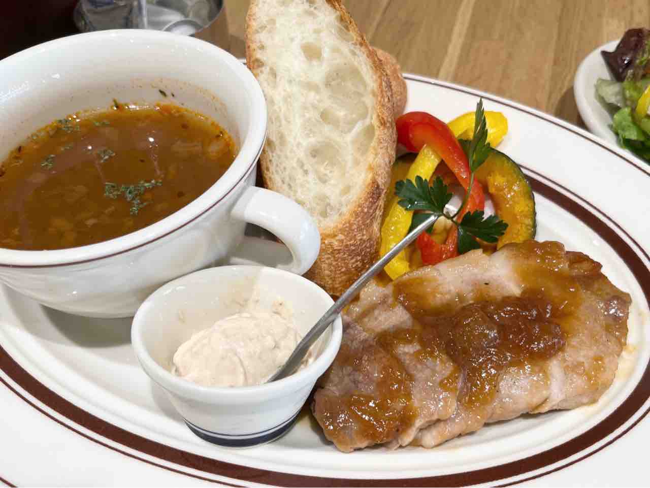 ポークジンジャー、スープ、バゲット、