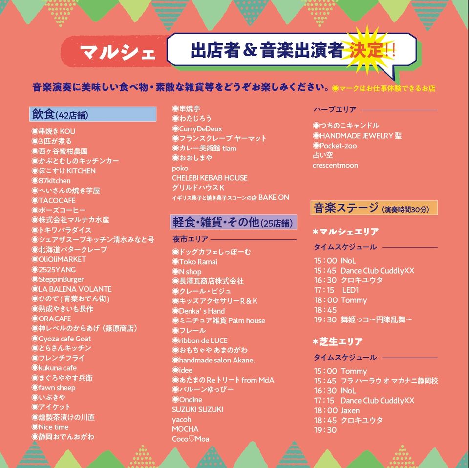 時 間:マルシェエリア(15:00~20:00)、芝生エリア(13:00~20:00)
